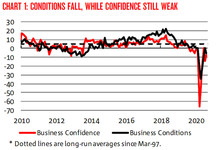 But in a sign the recovery might be short-lived, NAB’s monthly business survey found business conditions deteriorated across all states except NSW in August – dragging down the national index by 6 points to -6.