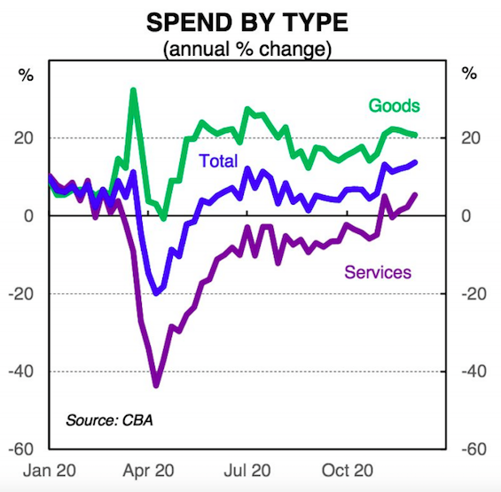 CBA’s data shows total income paid into customer bank accounts was up 10.5 per cent over the 12 months to December 11, with most of the extra income coming from government stimulus payments like JobKeeper and JobSeeker.