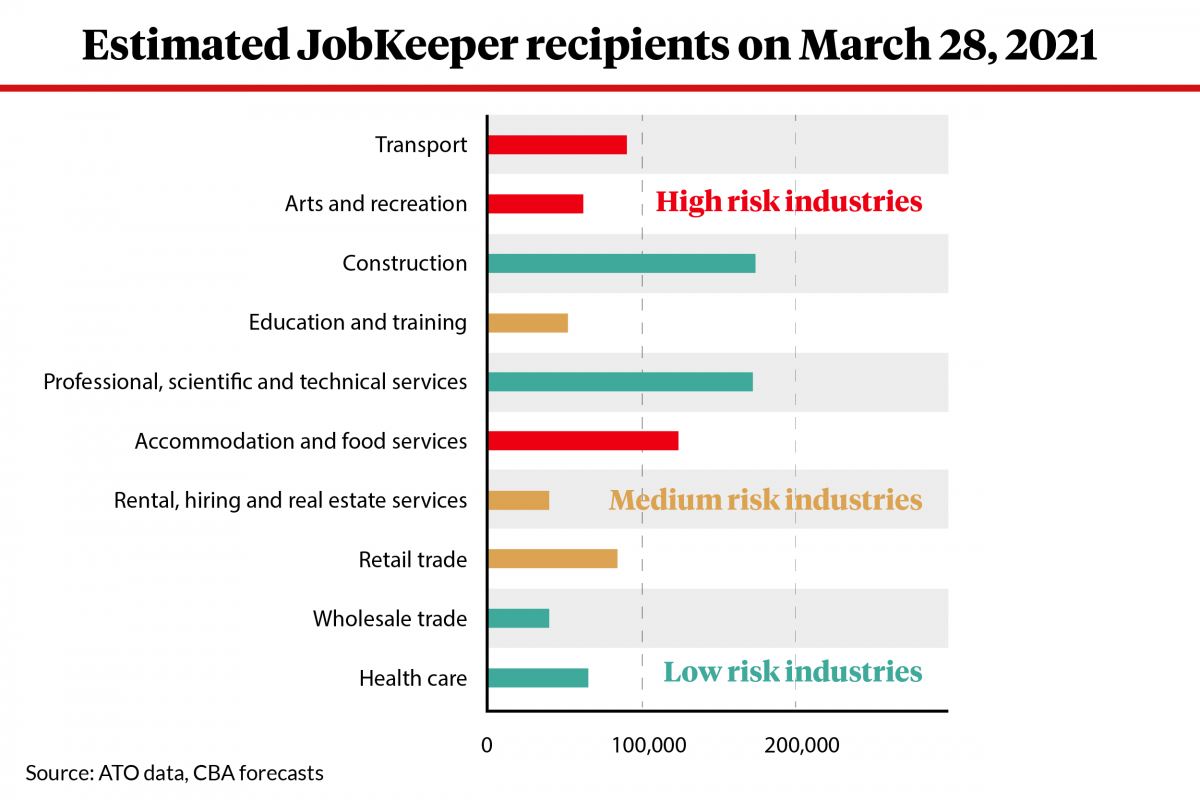 With less than three weeks to go until the federal government stops subsidising the wages of roughly 900,000 employees, economists at Commonwealth Bank have published new analysis breaking down the potential effect of the scheme’s withdrawal on March 28.
